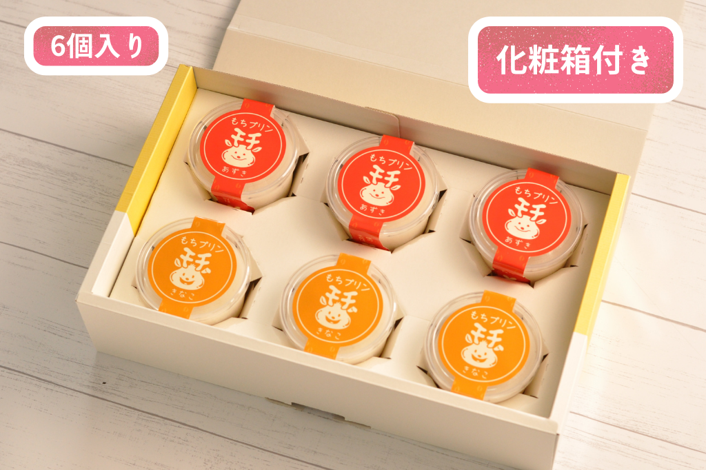 おもちが好きな方はもちろん、食べづらいと感じる方に安心してお召し上がりいただけるように粘りやべたつきを抑えた飲み込みやすさが特徴の「スプーンで食べるおもち」のもちプリンです。 「あずき」と「きなこ」の2種類をご用意いたしました。お好みでこだわりの抹茶みつをかけてお楽しみください。 抹茶みつは京都宇治抹茶を使用しており、濃厚かつ気品あふれる奥深い味わいです。もちプリンとの相性も良く、さらに美味しくお召し上がりいただけます。 内容量 ●2個入りの場合【もちプリンあずき】116g × 1個【もちプリンきなこ】116g × 1個【抹茶みつ】8g × 1個※木スプーン2本付属しております。 ●6個入りの場合(化粧箱(縦18.5×横30×高さ7.5㎝)に入れてお届けします)【もちプリンあずき】116g × 3個【もちプリンきなこ】116g × 3個【抹茶みつ】8g × 3個※木スプーン6本付属しております。...¥1,000 円(税込)¥1,000 円(税込)(税込) -